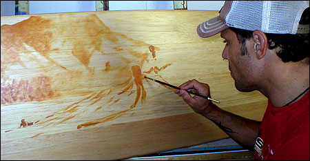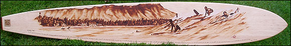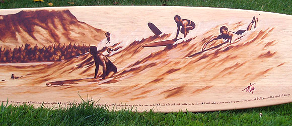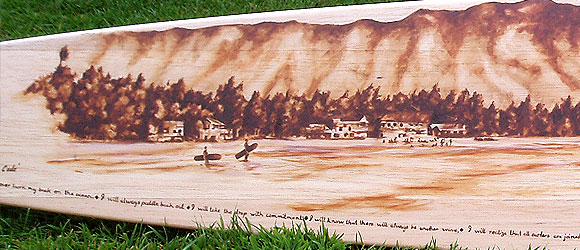 The Piece uses the natural color and tones of the wood to enhance the midtones and high lights of this piece and as a foot note, Tillack has carefully laid out the surfer's code as written by legendary surfer -- Shaun Tomson