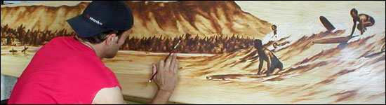 Tillack teamed up with Shaper Roy Sanchez to create a unique monotone oil painting, A Surfer's Code', which is a throw back to the original waikiki days of surfing. The art adorned a custom 11ft hand carved balsa wood surfboard which was a replica of the original equipment used back in the early days of surfing.