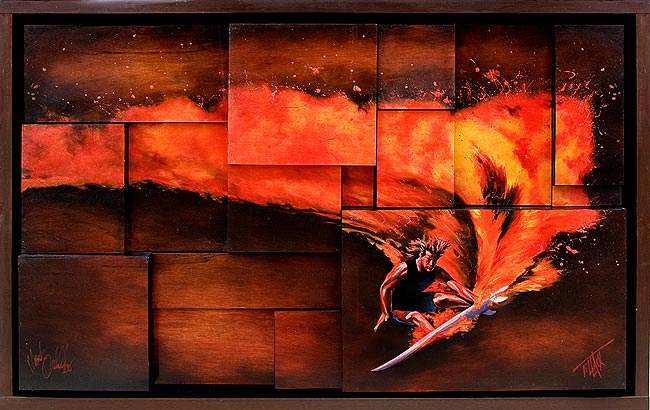 The concept of this 5.5ft x 3.5ft piece was created so that it spanned more than two dimensions, after painting the original works on wood, it was then cut up, and re-organized to be built on many different levels of depth giving a third dimensional quality.